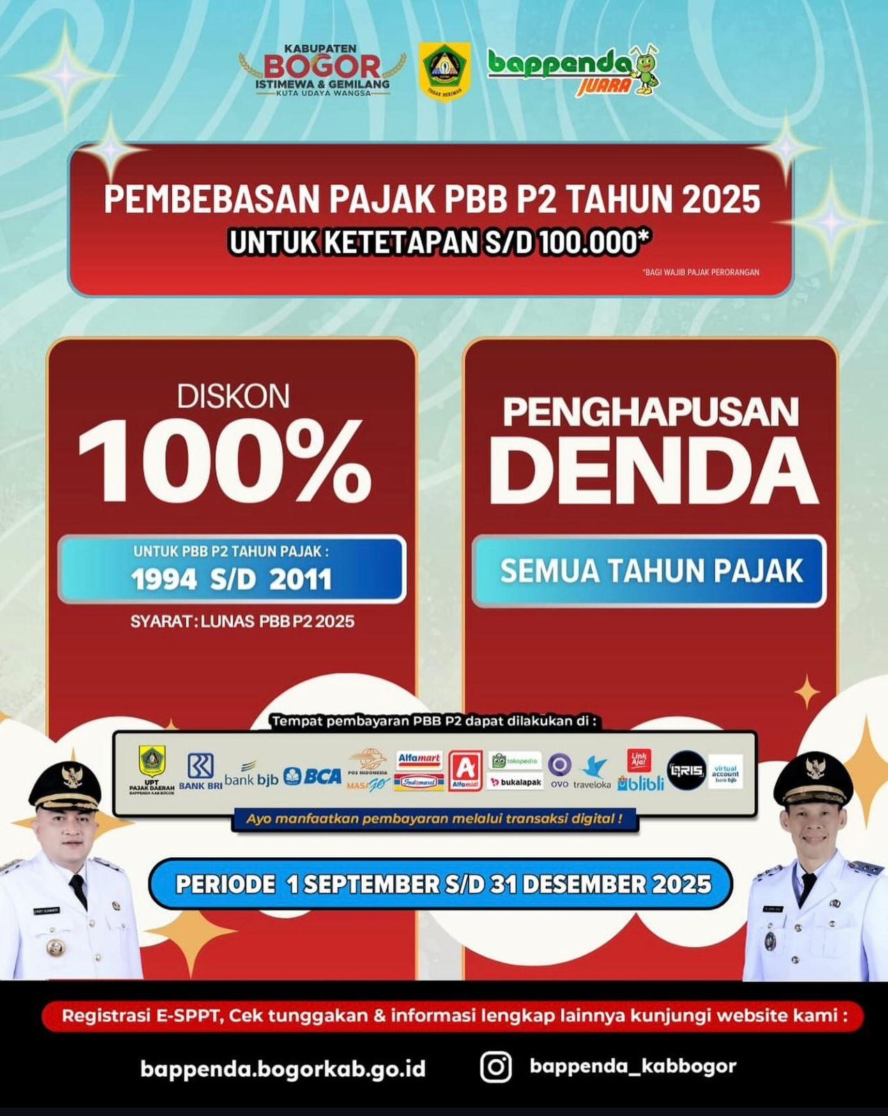 Mulai 1 September hingga 31 Desember 2025, masyarakat dapat memanfaatkan diskon 100% untuk PBB P2 tahun pajak 1994 hingga 2011, asalkan telah melunasi PBB P2 tahun 2025. Untuk wajib pajak yang nilai ketetapan pajaknya maksimal Rp100.000,- Pemerintah Kabupaten Bogor memberikan pembebasan penuh: pajak dianggap langsung lunas untuk tahun 2025 tanpa perlu melakukan pembayaran lagi dan kebijakan ini berlaku tanpa batas waktu.