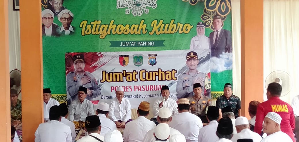 Menitpost.com, PASURUAN – Dalam rangka memberikan ruang komunikasi terkait keluhan, kritik, dan saran masyarakat terhadap Institusi Polri, Polres Pasuruan menggelar acara Jum’at Curhat bersama masyarakat Kelurahan Purwosari, Kecamatan Purwosari. Acara tersebut dilaksanakan bersamaan dengan acara Istighotsah Kubro yang dilaksanakan oleh PCNU Ranting Purwosari di Kantor Kelurahan Purwosari Kecamatan Purwosari, Kabupaten Pasuruan, Jum’at (6/1/23).